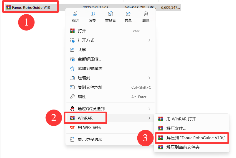 1. 解压安装包:①鼠标右击【Fanuc RoboGuide V10】压缩包②选择电脑上安装的解压软件(如:360压缩)③点击【解压到 Fanuc RoboGuide V10】。