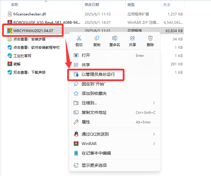 2. 双击打开解压后的【Fanuc RoboGuide V10】文件夹,右击【WRCYYXKHJ2021.04.07】点击以管理员方式运行。