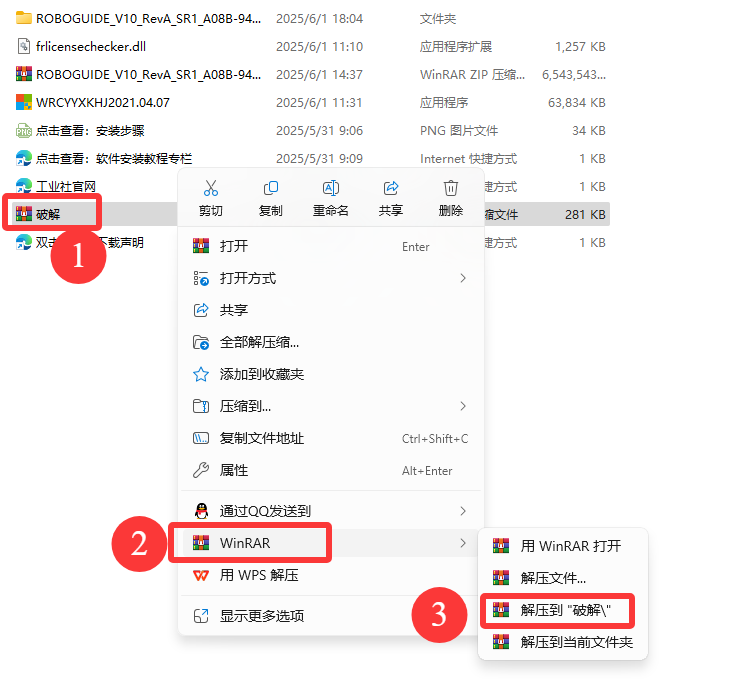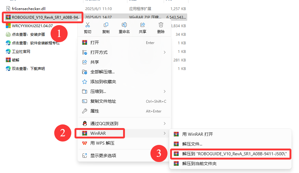 7. 解压安装包:①鼠标右击【ROBOGUIDE_V10_RevA_SR1_A08B-9411-J500】压缩包②选择电脑上安装的解压软件(如:360压缩)③点击【解压到 ROBOGUIDE_V10_RevA_SR1_A08B-9411-J500】。