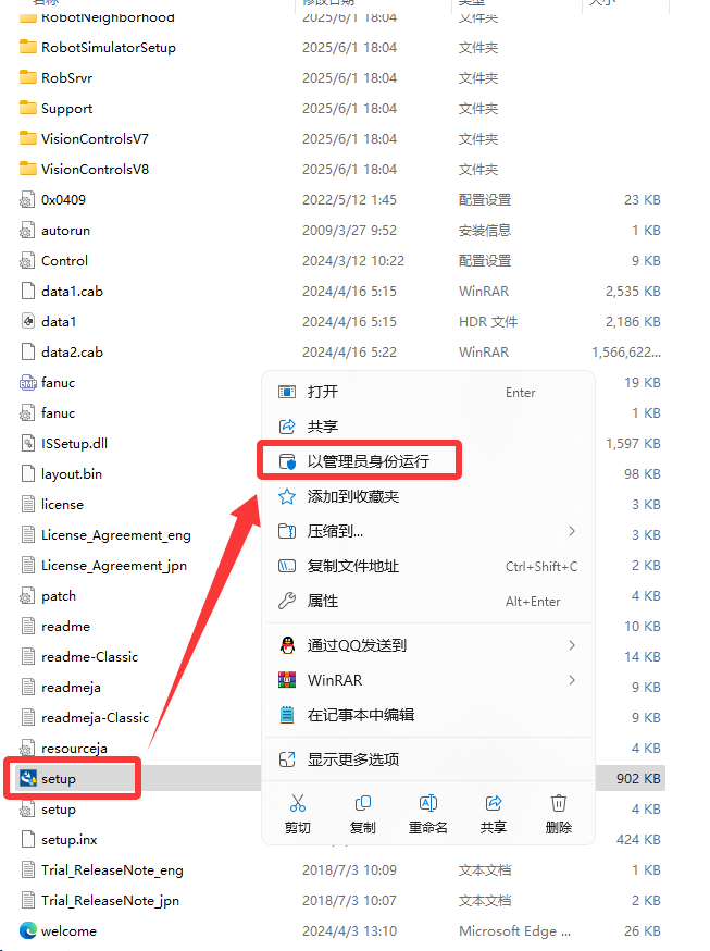 8. 双击打开解压后的【ROBOGUIDE_V10_RevA_SR1_A08B-9411-J500】文件夹,鼠标右击【SetUp】以管理员方式运行。
