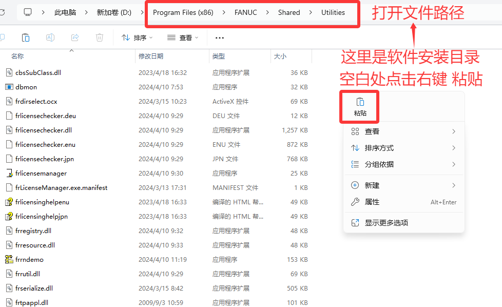 30. 打开软件安装的盘符(步骤14所选的盘符),依次打开Program Files (x86)\FANUC\Shared\Utilities,空白处右击,选着“粘贴”。