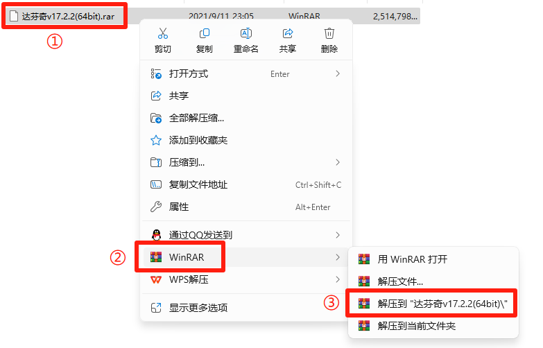 1.解压安装包:①鼠标右击下载的压缩包②选择电脑上安装的解压软件(如:360压缩)③点击【解压到 XXX】。