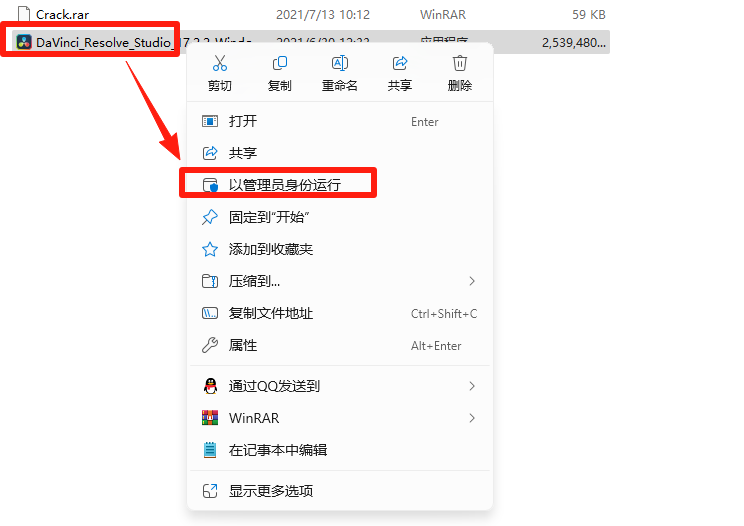 2.双击打开解压后的文件夹,右键点击【DaVinci Resolve】,以管理员身份运行。