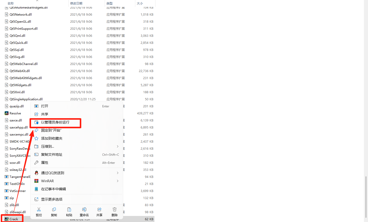 15.右键点击上一步粘贴的【Crack】,以管理身份运行。