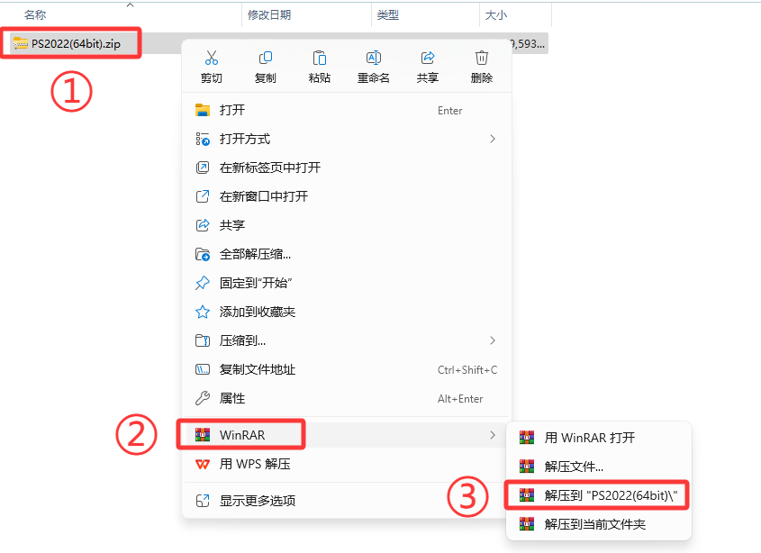 1.解压安装包:①鼠标右击【PS2022(64bit).zip】压缩包②选择电脑上安装的解压软件(如:360压缩)③点击【解压到 PS2022(64bit)】。