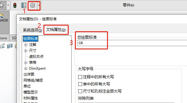 2、访问文档属性。点击“选项/文档属性”。在下拉菜单中选择“GB”作为“总绘图标准”。