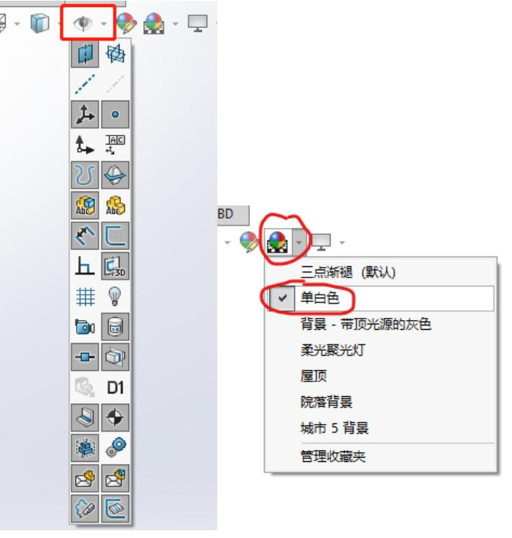 3、可修改视图设置和布景。在前导工具栏中,修改【隐藏/显示项目】的类别,修改【应用布景】为“单白色”。如下图所示。