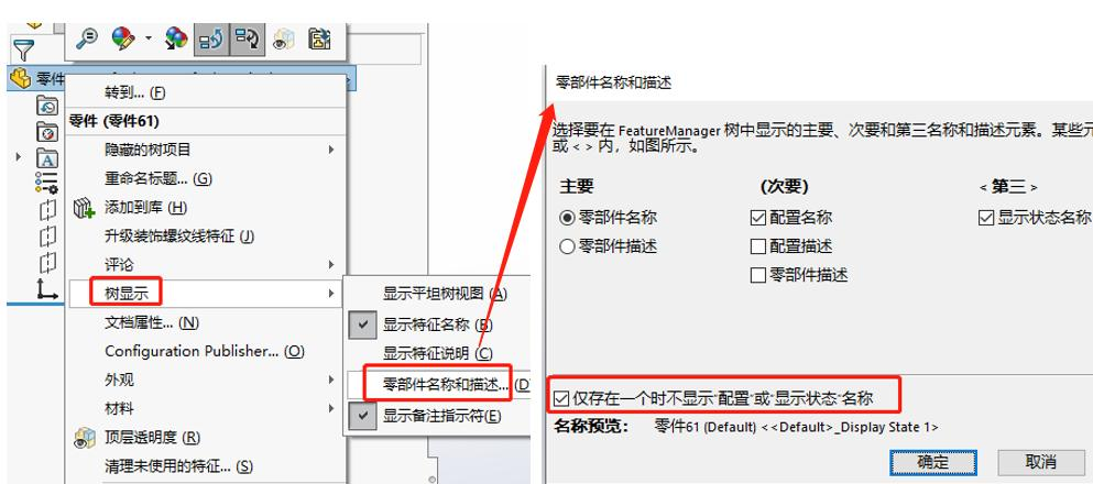 4、调整FeatureManager树显示。右键单击FeatureManager设计树顶部的零件名称。选择【树显示】/【零部件名称和描述】,勾选【仅存在一个时不显示“配置”或“显示状态”名称】。