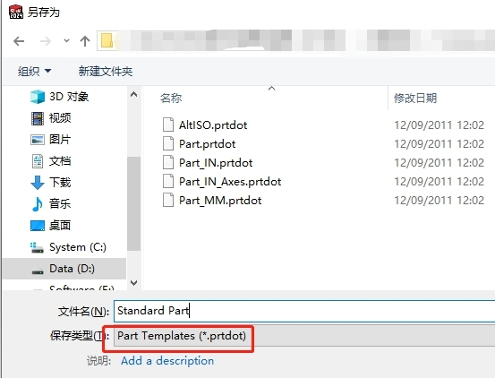 6、另存为模板。单击【另存为】,更改【保存类型】为“Part Templates(*.partdot)”。模板文件可保存到任意位置的文件夹中(建议新建一个专门放置模板的文件夹)。
